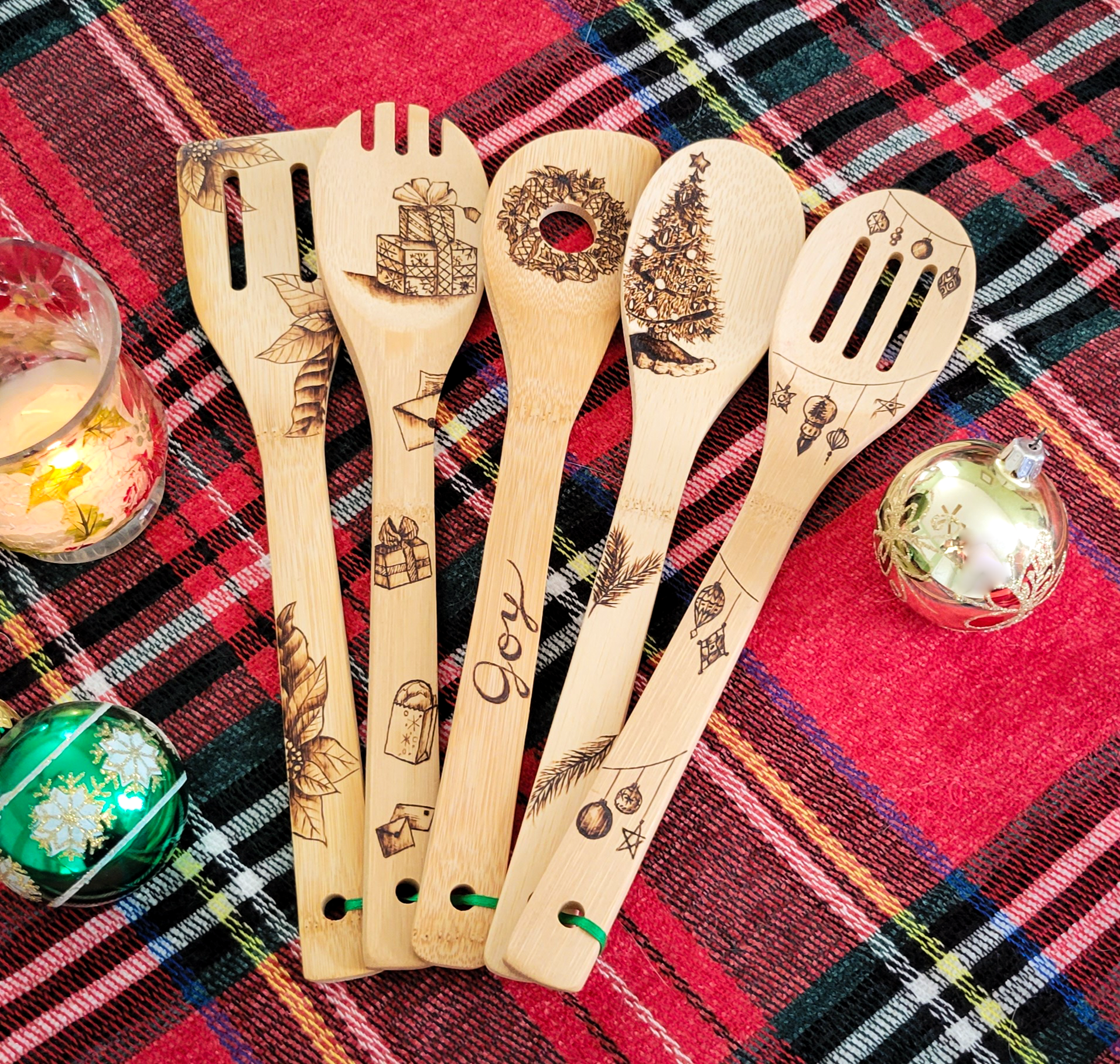 Throughout my years of woodburning, One of my favorite objects to woodburn are wooden spoons. They provide a perfect, unique accent to a kitchen, and as they are all woodburned by hand, are each one-of-a-kind. I like to create spoons that match different seasons, as wedding gifts, or with a verse or quote! I create some sets upon commission, especially wedding sets, with the last name engraved onto the handle. Other sets are created just based upon what I love about each season! Many of these spoons are for sale in my Etsy shop, Hint of Whimsy Designs, if this is a piece of handmade décor that interests you!